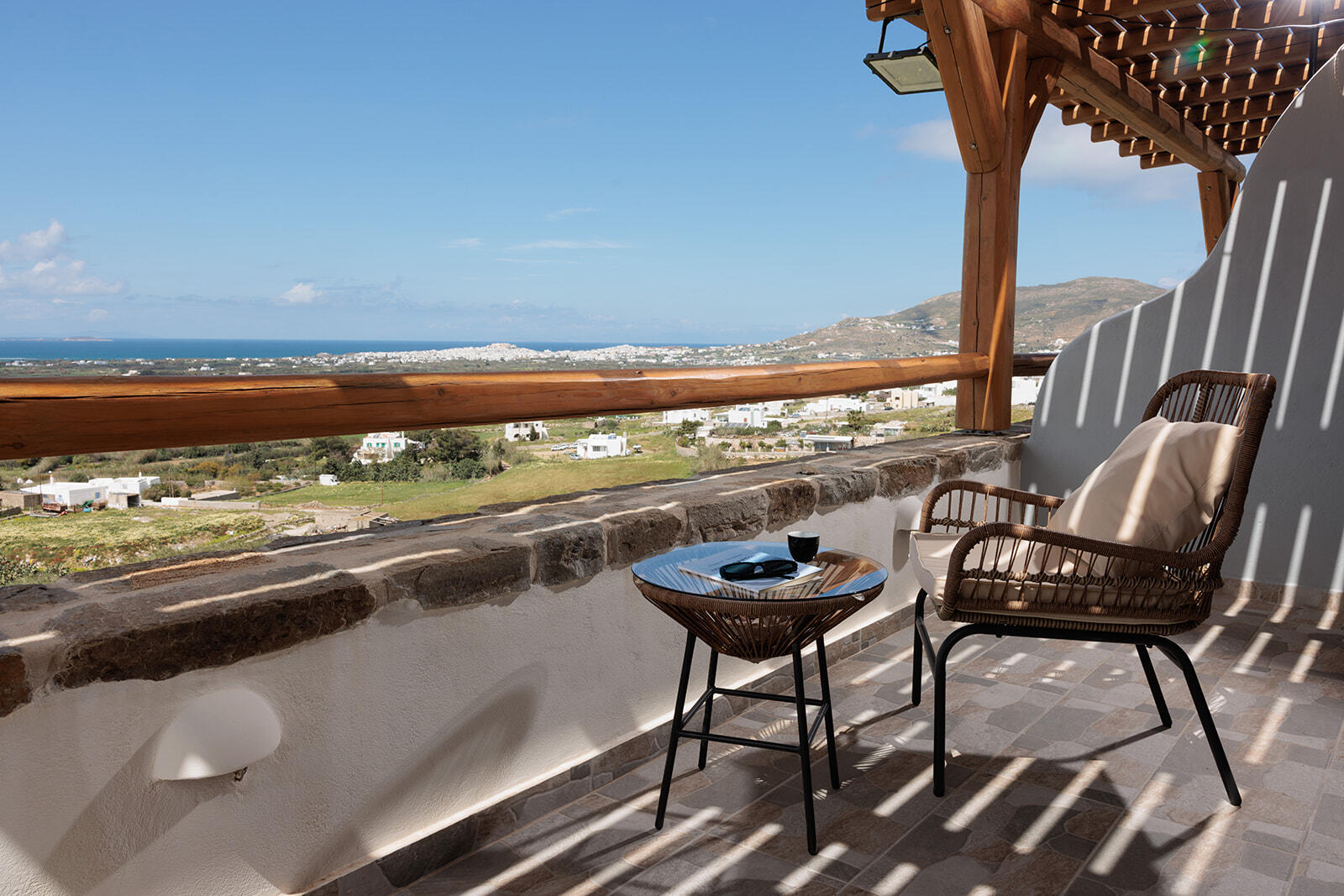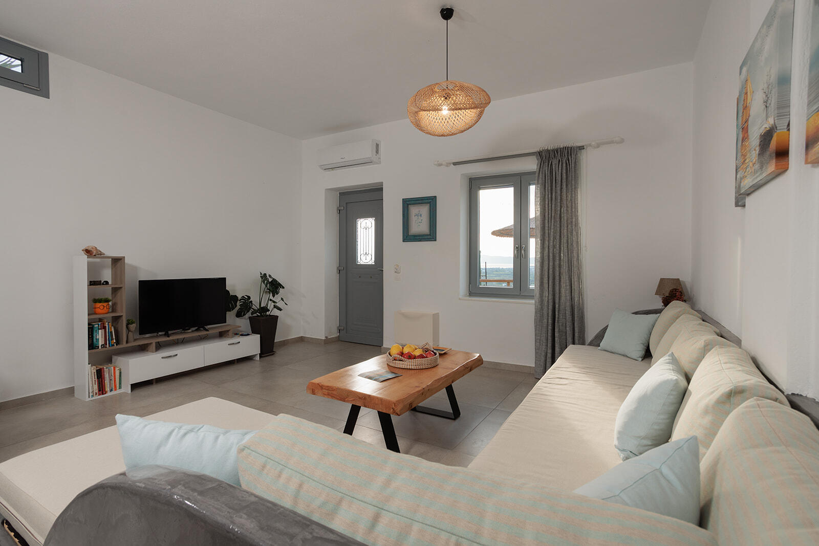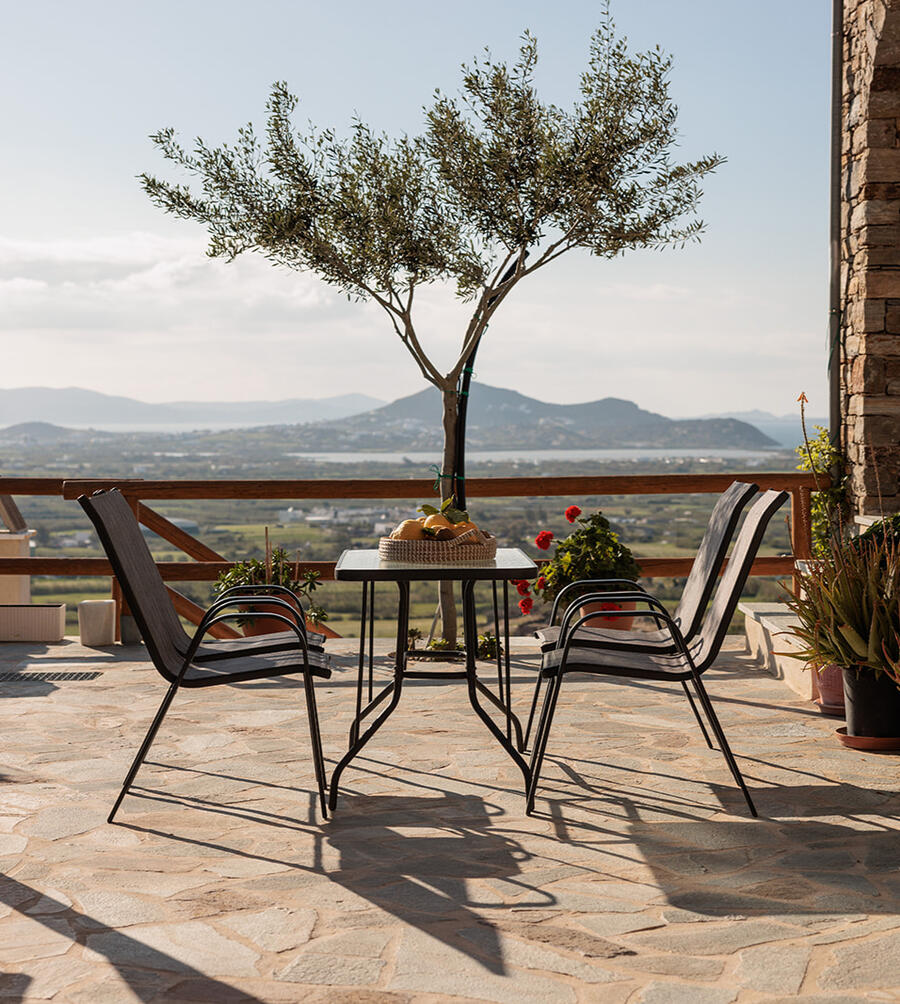 This apartment can sleep a family of five. It has one single and two double bedrooms, two bathrooms and a spacious living room. The apartment has a terrace at the main entrance and a balcony on the third floor with the most amazing views of the island.