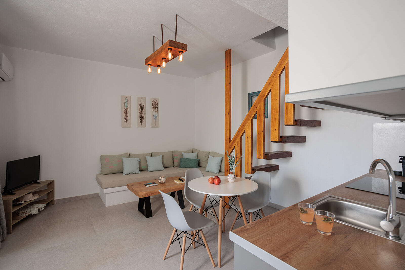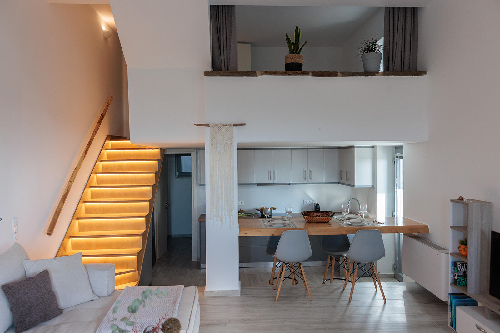 This apartment can sleep a family of three, designed with an open-plan kitchen and living room area. There is a stairway to the loft shared bedroom (one double bed and a single bed). If necessary the L shape couch in the living room can also be used as a bed to sleep one person.
